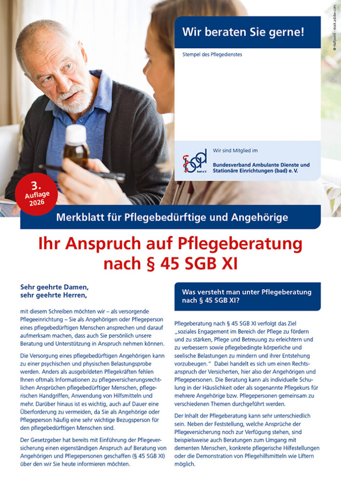 Der Gesetzgeber hat berreits mit der Einführung der Pflegeversicherung einen eigenständigen Anspruch auf Pflegeberatung von Angehörigen und Pflegepersonen geschaffen (§ 45 SGB XI), über den dieses Merkblatt informieren soll.